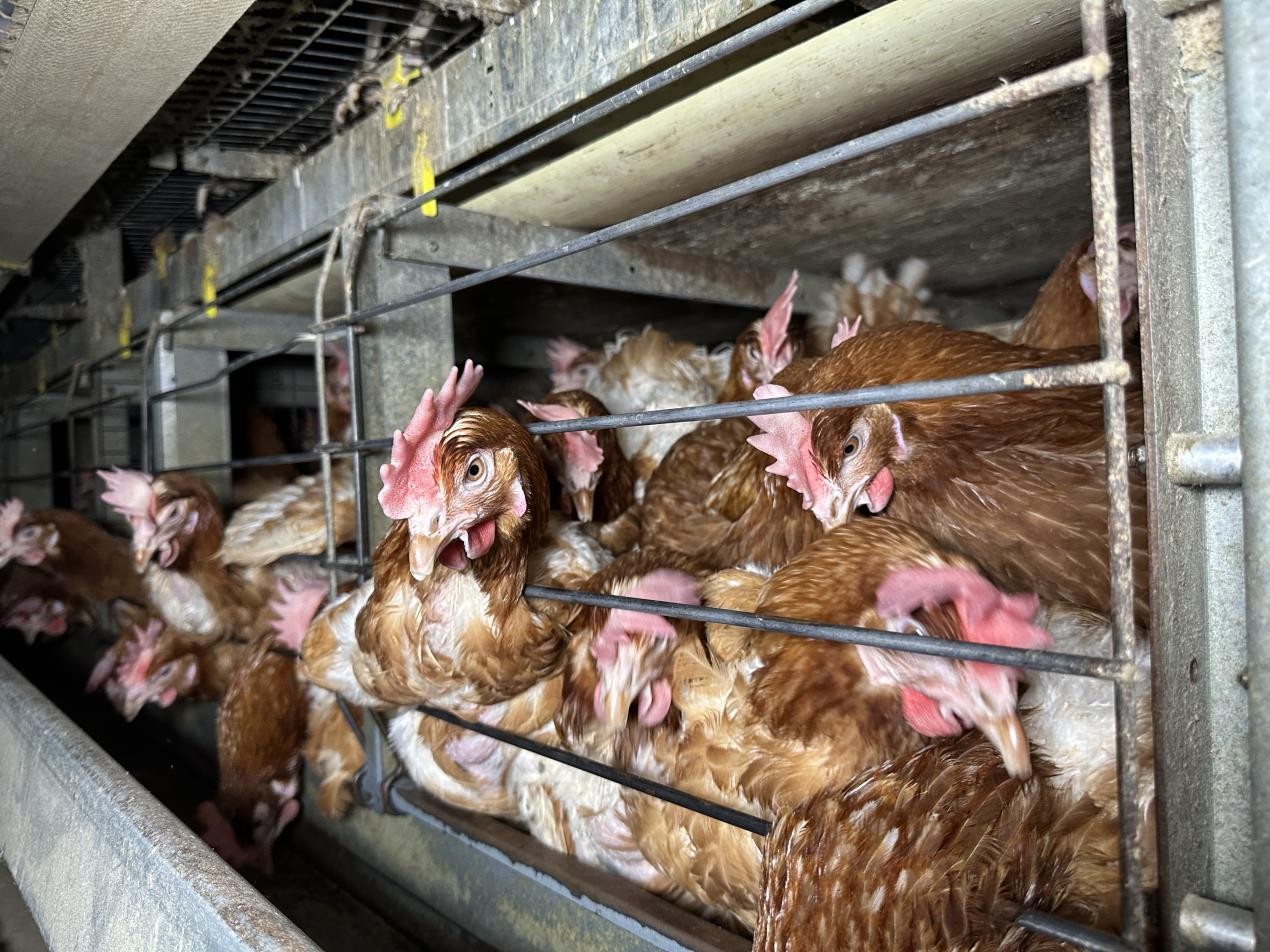 Each hen in an enriched colony cage is legally given just 750cm² of space. Viva!’s footage shows cages stacked seven tiers high, hens standing on wire flooring, birds with feather loss and overgrown claws, and in one instance, a dead hen left inside a cage near food and water.